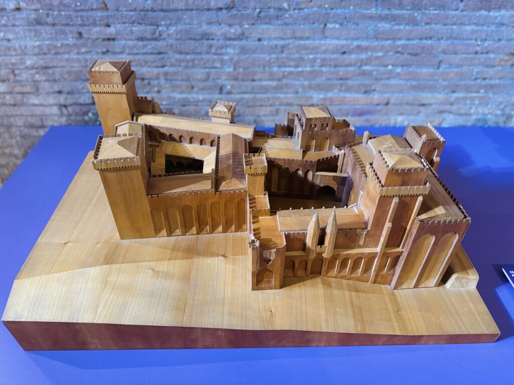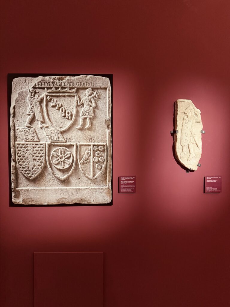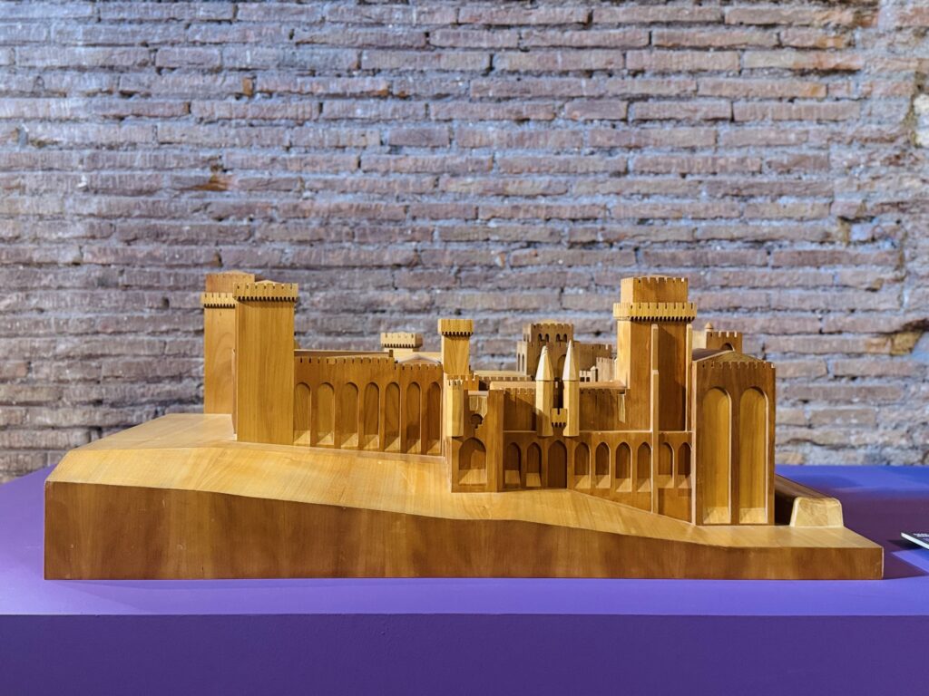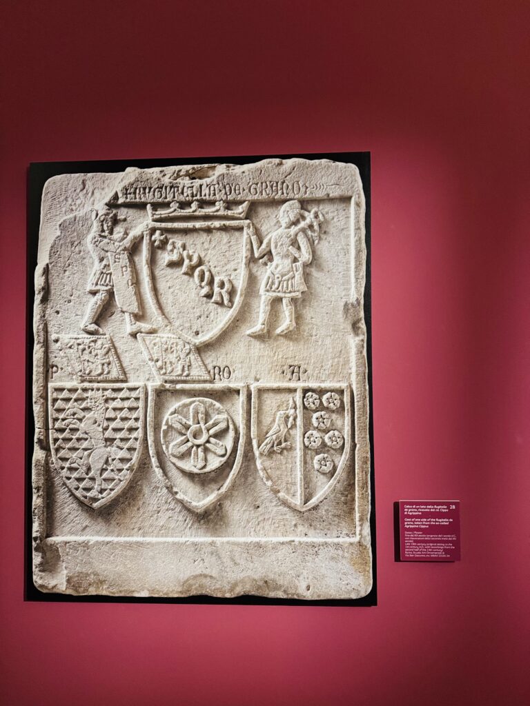 La mostra si apre con il racconto dell’Anno Santo del 1300, indetto da Bonifacio VIII, pontefice che per primo istituzionalizzò l’idea di un “perdono generale” ogni cento anni. Una figura potente, legata simbolicamente anche al sito della mostra: il Castello delle Milizie, con l’iconica torre medievale che ingloba i Mercati di Traiano, fu proprietà della famiglia Caetani. Tra gli oggetti esposti, spiccano le misure per olio e vino del Comune di Roma, con lo stemma di Bonifacio VIII, a testimonianza dell’intervento civile nella regolazione del commercio e della vita pubblica.