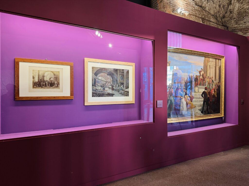 Tra i protagonisti della mostra spicca Cola di Rienzo, figura affascinante e controversa, simbolo del sogno di una Roma libera e repubblicana, che per un breve momento si oppose al dominio baronale e clericale. Dipinti, disegni e sculture dell’Ottocento illustrano la sua parabola, ispirati alla Cronica dell’Anonimo Romano: tra questi, il celebre dipinto di Carlo Felice Biscarra, che lo ritrae nell’atto di arringare il popolo. La mostra espone anche monete emesse dal Senato romano sotto la sua guida, testimonianza tangibile di un potere temporaneamente svincolato dall’autorità papale.