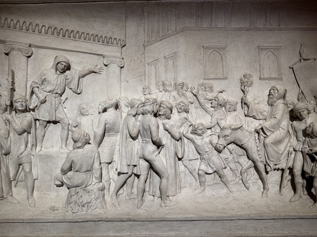 Durante il Giubileo del 1350, la Roma medievale si trasforma. Priva della guida del papa, è la città intera – nobiltà, clero e cittadini – a farsi carico dell’organizzazione dell’accoglienza dei pellegrini. Un documento eccezionale esposto in mostra è l’epigrafe dell’ospedale di San Giacomo in Augusta, fondato dal cardinale Pietro Colonna nel 1339, esempio di come la solidarietà cittadina abbia supplito all’assenza del papato. A testimonianza di un’efficienza straordinaria, a Roma erano attivi quasi trenta ospedali dedicati all’assistenza dei viandanti. Non mancano le ombre: il flagello della peste del 1348 e il terremoto del 1349 gettano Roma in ginocchio. Una potente statua dell’Arcangelo Michele, proveniente dall’Ospedale di San Giovanni in Laterano, ricorda la devozione popolare e le preghiere di protezione dalla morte e dalla rovina.