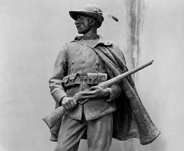 Modello dell’Alpino in gesso – particolare. Si noti la patinatura a bronzo del volto e la vera piuma del cappello [/caption]