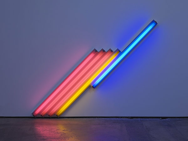 DAN FLAVIN Untitled (for Frederika and Ian) 3, 1987 Pink, yellow, and blue fluorescent light 183 cm long on the diagonal 72 1/8 in long on the diagonal Edition 2 of 5 (CL no. 472) © 2018 Estate of Dan Flavin / Artists Rights Society (ARS), New York. Courtesy David Zwirner & Cardi Gallery[/caption]