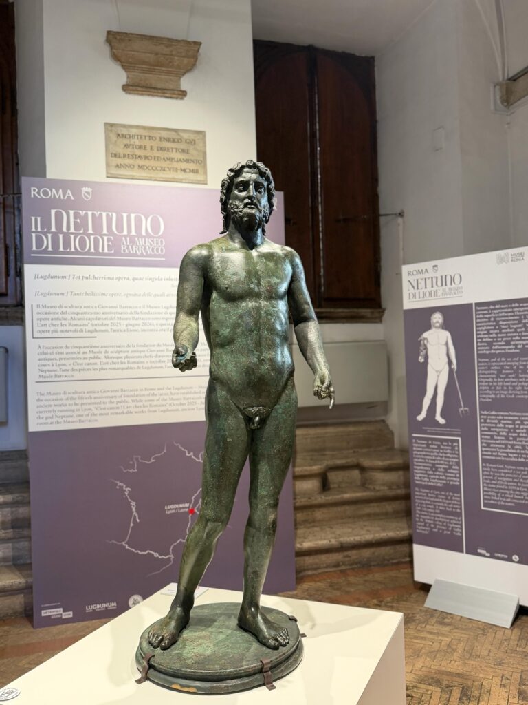 L’arrivo dell’opera a Roma è il risultato di un prestigioso scambio internazionale promosso da Roma Capitale – Assessorato alla Cultura e Sovrintendenza Capitolina ai Beni Culturali – in collaborazione con la Métropole Grand Lyon. L’iniziativa rientra in un accordo di cooperazione culturale stipulato in occasione del cinquantesimo anniversario del museo lionese e si accompagna alla presenza, a Lione, di alcuni capolavori del Museo Barracco nella mostra C’est canon. L’art chez les Romains. L’esposizione del Nettuno coincide inoltre con una fase di rinnovamento del Museo Giovanni Barracco, che negli ultimi mesi ha visto un significativo ripensamento dei suoi spazi. La sala al piano terra, destinata ad accogliere la statua, è stata trasformata in un nuovo ambiente dedicato alle mostre temporanee di alto profilo, mentre una riorganizzazione complessiva dell’accoglienza – con nuovi pannelli didattici e una segnaletica aggiornata – mira a migliorare l’esperienza di visita e la fruizione del patrimonio.