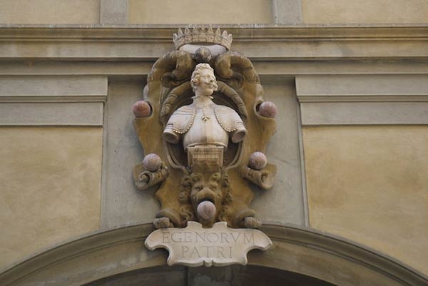 Lo stemma venne collocato sulla sommità dell’arcata centrale della Loggia del Grano voluta appositamente dallo stesso Granduca come luogo di commercio del grano, che si trova in via de’ Neri a pochi passi da Palazzo Vecchio.