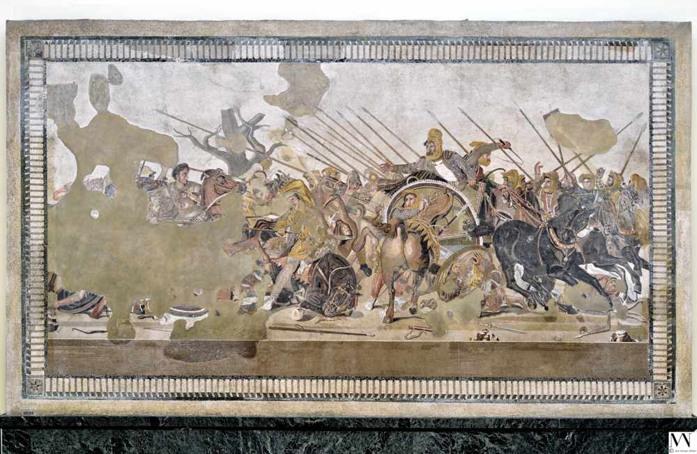 Il capolavoro assoluto è però il grande mosaico pompeiano della Casa del Fauno, in cui si assiste all’impetuosa carica di Alessandro e alla fuga di Dario.