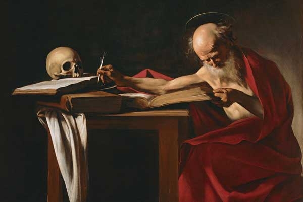 Il San Girolamo scrivente di Caravaggio è un olio su tela che presenta il santo nell’aspetto del penitente mentre, assorto nella lettura, allunga il braccio per intingere la penna nel calamaio. La sua immobilità si estende all’ambiente, un interno appena accennato con pochi oggetti rivelati dalla luce che svolge un ruolo determinante. “L’opera è infatti un dialogo della luce e dell’ombra: la luce chiara colpisce le pagine aperte su cui è posato il teschio: solo in presenza della morte si comprende e s’illumina il libro della vita”. La tela per la sua modernità viene datata tra la fine del 1605 e i primi mesi del 1606, ovvero ai momenti estremi della fase romana del Caravaggio.