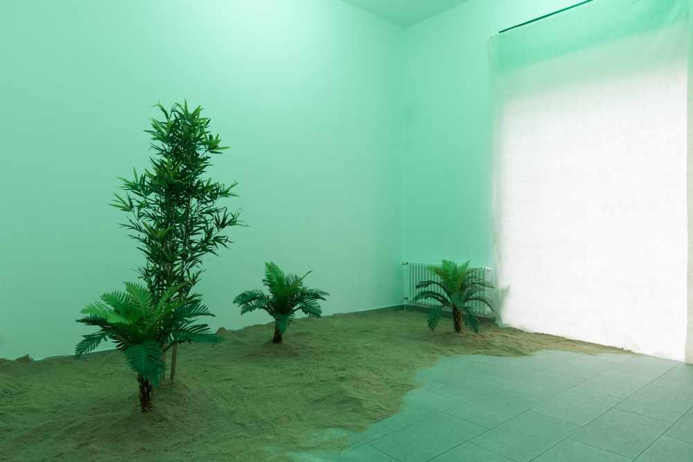 I due artisti hanno dunque dato vita a un’opera immersiva ed esperienziale. La morbida sabbia chiara, le piante tropicali volutamente artificiali, la sognante voce femminile che parla da una dimensione lontana sono gli elementi che trasformano temporaneamente la project room in una paradisiaca oasi naturale.