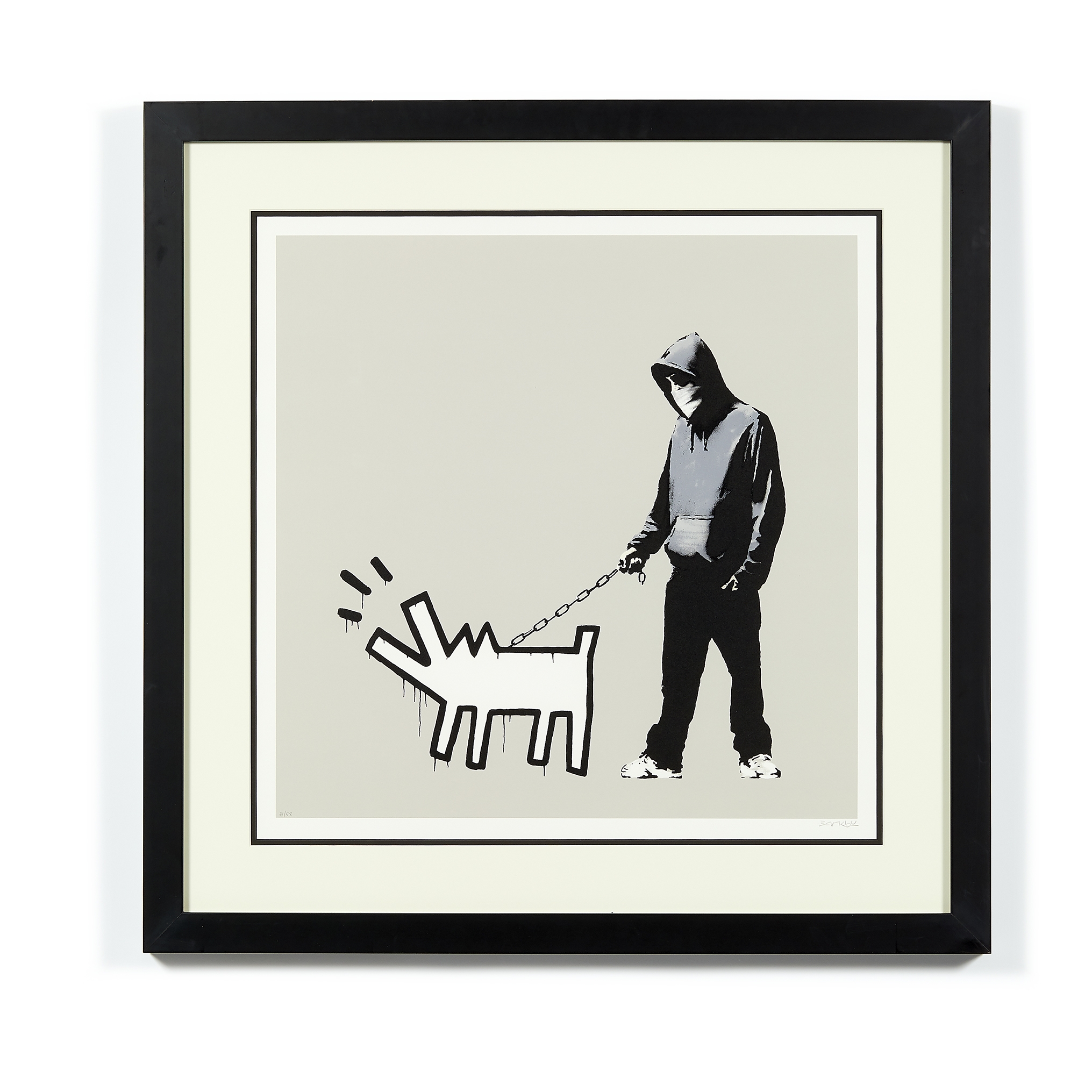 Infine, grande protagonista di tutta la selezione è il capolavoro di Banksy (Inghilterra, 1974) “Choose your weapon (grey)” del 2010, presentato con una stima iniziale di 30.000-50.000€. L’opera, una serigrafia sui toni dominanti del grigio, raffigura una citazione diretta del “barking dog” di Keith Haring tenuto al guinzaglio da una figura umana vestita di scuro, un ragazzo dal volto coperto, il cui aspetto minaccioso è mediato dalla silhouette stilizzata dell’animale. In molti casi, la critica ha letto in questa composizione un ritratto ironico della gang-culture inglese e del loro utilizzo violento dei cani. Lo stencil originale, da cui è tratta la serie serigrafica, è apparso per la prima volta su un muro del The Grange pub di Bermondsey a Londra, nel 2010.