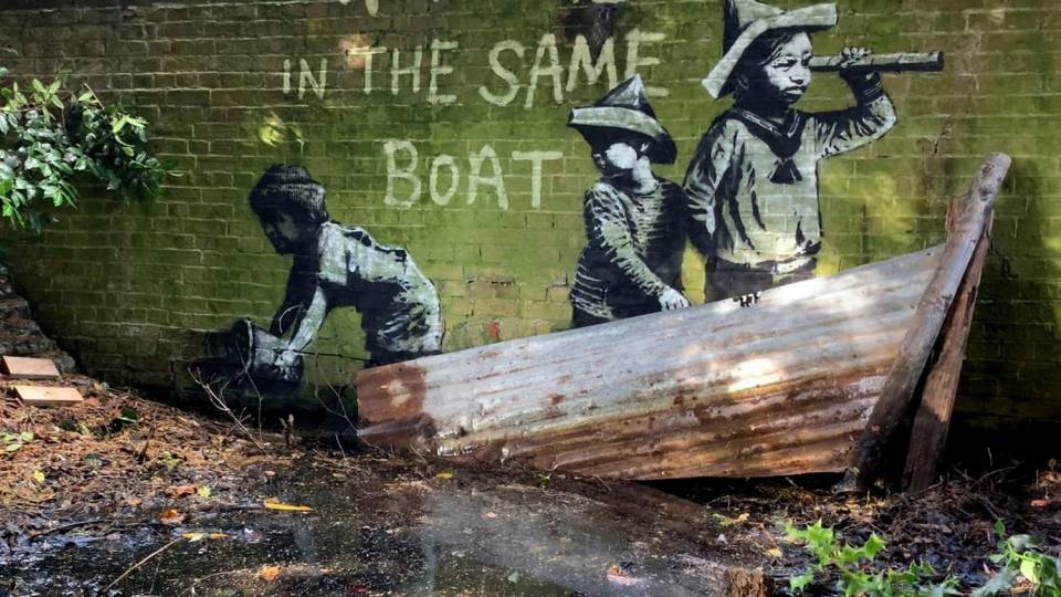 Nel primo graffito mostrato c’è uno dei suoi iconici topi intento a sorseggiare un cocktail su una sdraio. Un’altra opera, dipinta sopra una panchina, rappresenta una pinza-gru delle macchinette delle sale giochi o del luna park per estrarre premi; su un muro accanto a un cassonetto dell’immondizia appare invece un enorme gabbiano pronto a banchettare; un altro graffito/installazione raffigura tre bambini su una barca realizzata con una lamiera appoggiata contro un muro di mattoni verdi, con la scritta “Siamo tutti sulla stessa barca”, esplicito riferimento alla crisi climatica. Questa installazione è stata in parte rimossa dalle autorità locali, in vista del mal tempo, in quanto bloccava uno scarico. Tuttavia, secondo la Bbc, sarà rimessa a breve al suo posto.
