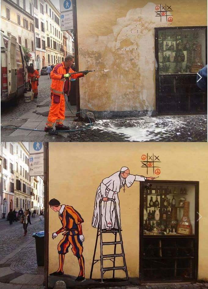 Autori della distruzione dell’opera, invece, sembrano essere stati i Vigili Urbani che, avvisati della presenza dell’immagine che ritraeva il Papa nell’atto di giocare a tris utilizzando il simbolo della pace, sono prontamente intervenuti. Ma i social avevano già fatto da cassa da risonanza e il murales, efficace nella sua sintesi che raffigura il Pontefice nell’atto di artefice di pace (sotto lo sguardo vigile di una Guardia svizzera che fa da “palo” durante il gioco), era già rimbalzato ovunque, rendendo di fatto inutile l’operazione di pulitura del muro.