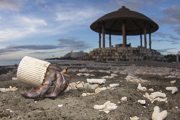 Nell’isola giapponese di Okinawa, un paguro eremita usa un tappo di plastica per proteggere il suo addome molle. In spiaggia gli uomini raccolgono le conchiglie usate dai paguri e abbandonano rifiuti. FOTO (Shawn Miller)[/caption]