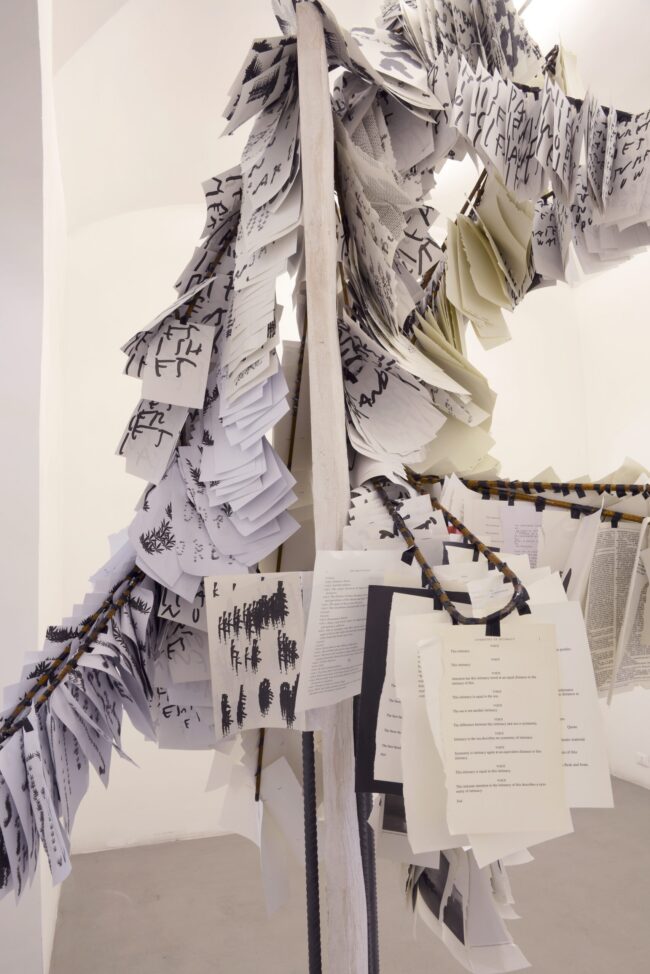 Una struttura, in acciaio e cemento, materiali propri del suo lavoro, a cui è applicata una moltitudine di pagine di carta, alcune dipinte: è l’interento site specific “Stamen papers”