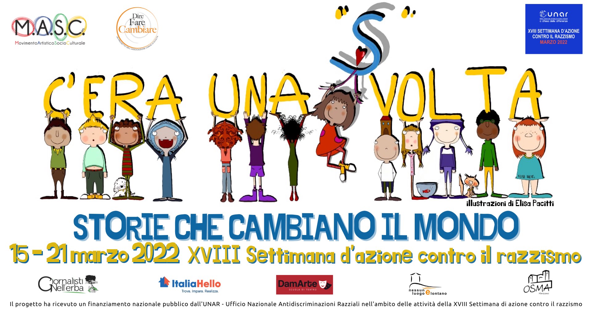 C’era una (S)volta – storie che cambiano il mondo è un progetto articolato in diverse iniziative, promosso dalle Associazioni M.A.S.C. APS e Dire Fare Cambiare APS (due associazioni no profit che operano nel settore culturale e della formazione) in collaborazione con ItaliaHello Onlus, Nessun luogo è lontano, Il Refuso Aps con il progetto Giornalisti nell’Erba, Scuola di Teatro DamArte di Capena e Oratorio Osma di Marsciano (PG), CSV LAZIO e realizzato grazie al contributo dell’Unar (Ufficio Nazionale Antidiscriminazioni Razziali della Presidenza del Consiglio dei Ministri).