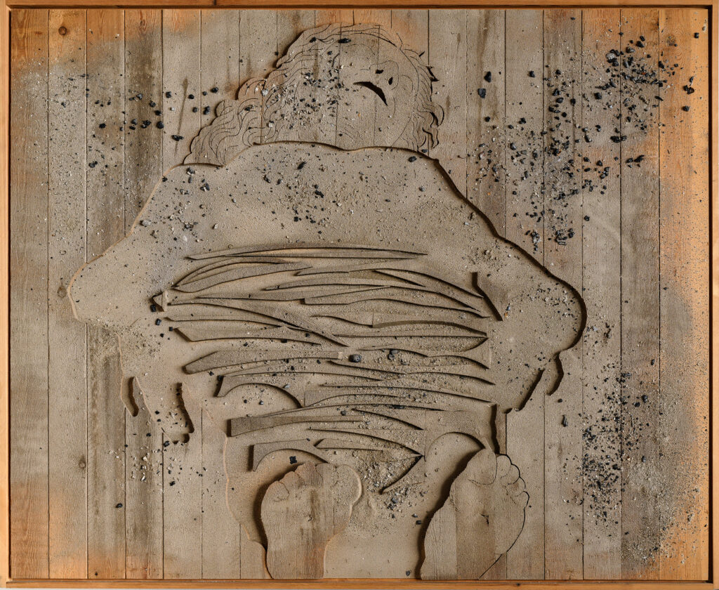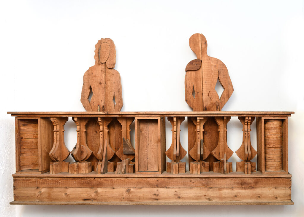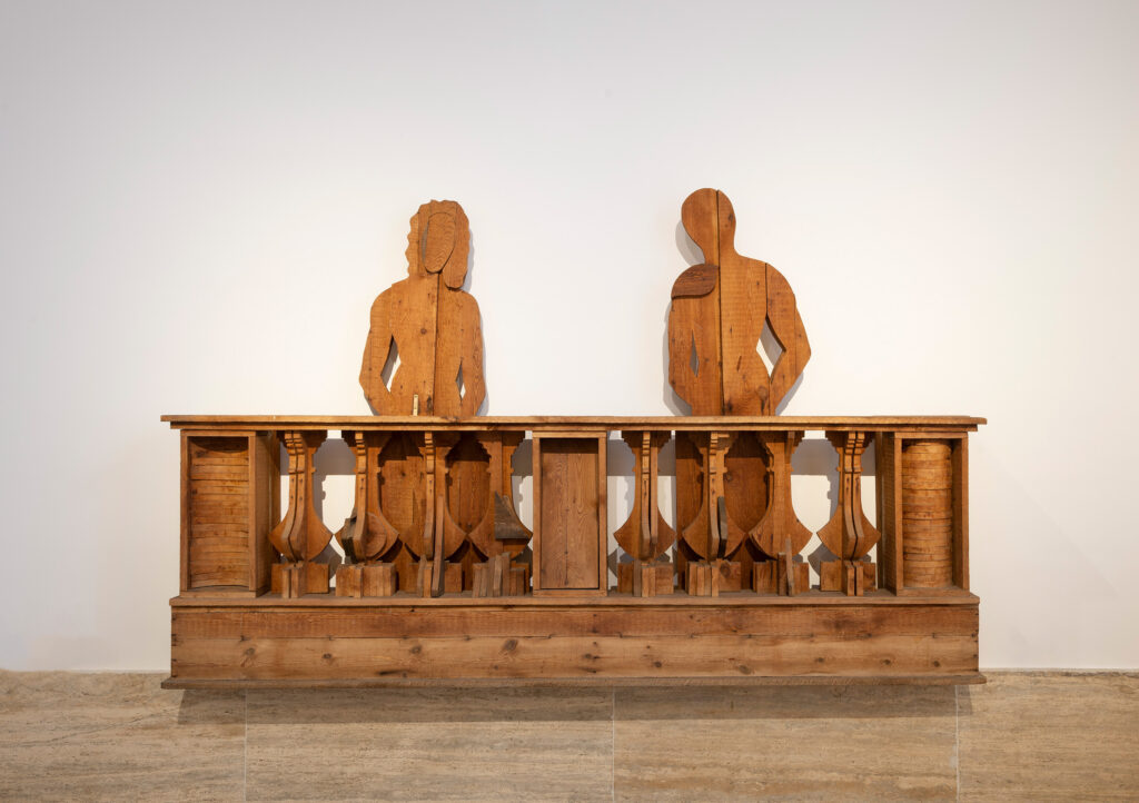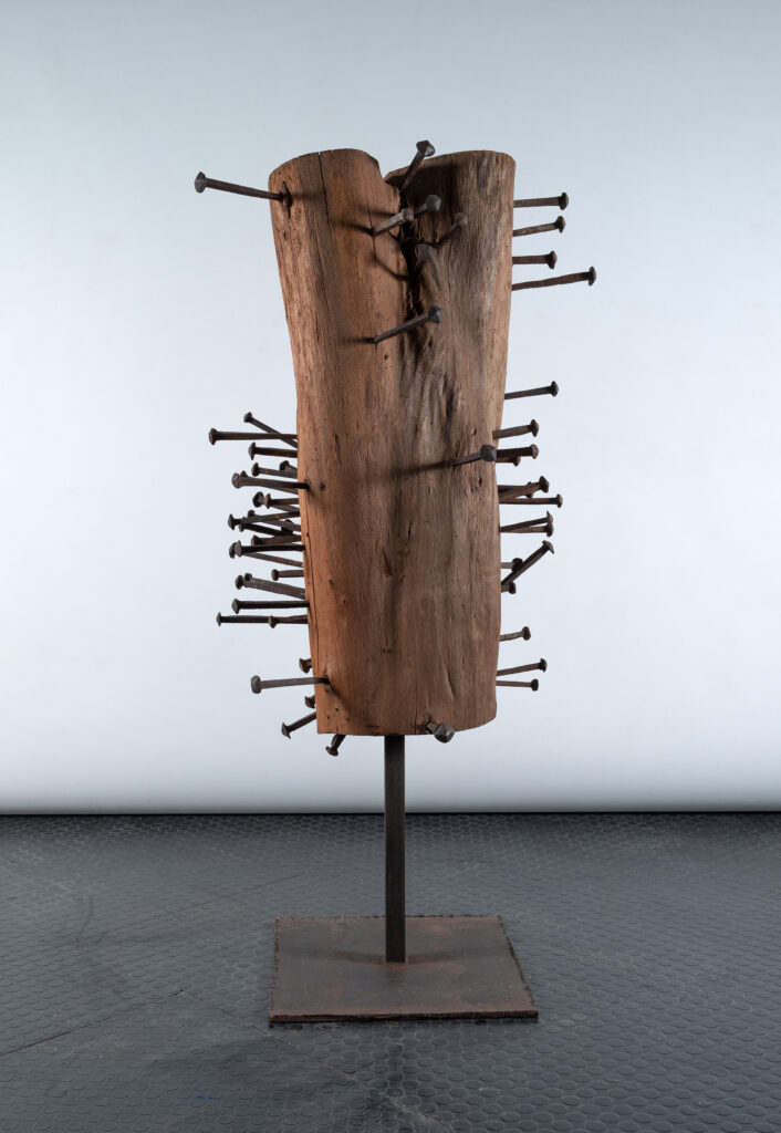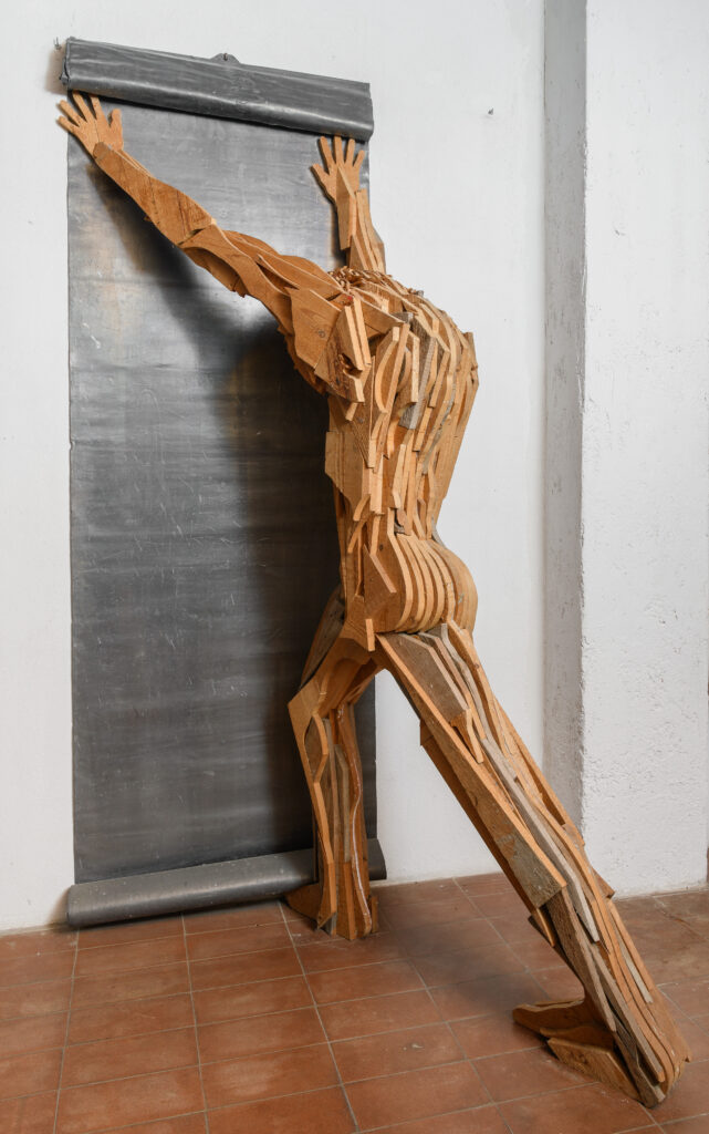 Tra i momenti più toccanti della mostra figurano le opere che affondano le radici nella memoria personale dell’artista. “Tela di Penelope”, ispirata alla nonna tessitrice, e “Arpa birmana” evocano l’infanzia abruzzese di Ceroli, rievocata attraverso materiali semplici, profumi perduti e gesti quotidiani. “Primavera”, omaggio ai giardini di Palazzo Farnese, richiama l’architettura del paesaggio e il legame con la natura, mentre “La battaglia” (1978), monumentale e potente, rilegge la “Battaglia di San Romano” di Paolo Uccello attraverso una sensibilità contemporanea, dedicando l’opera alla memoria di Pier Paolo Pasolini, con cui Ceroli collaborò. Particolarmente significativo è il ritorno in mostra di “Composizione” (1957–1958), un tronco inchiodato che ottenne nel 1960 il Premio per la giovane scultura da Cesare Brandi e che segna l’esordio del giovane Ceroli nella collezione della GNAMC.