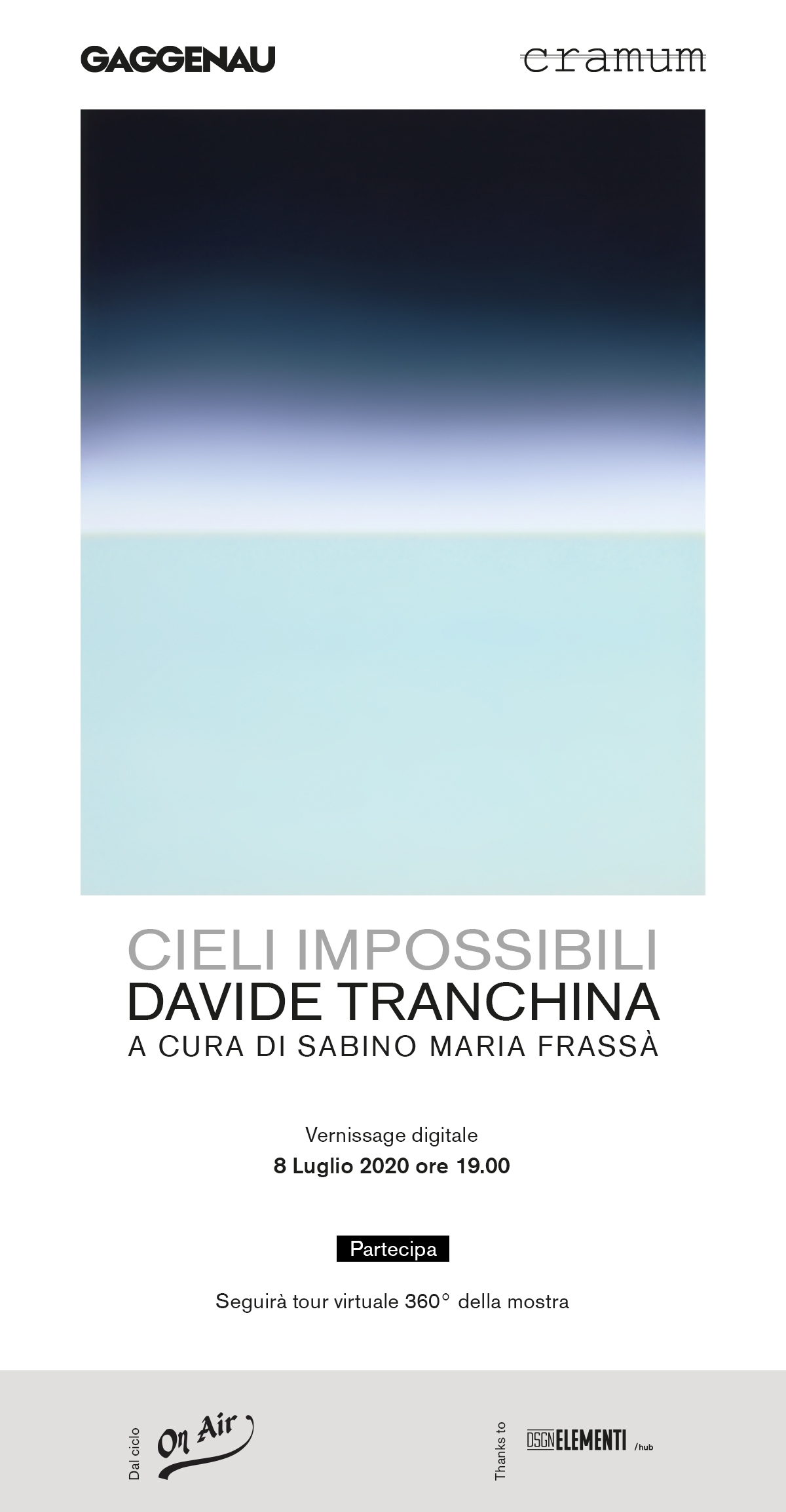 “L’artista – racconta il curatore – evoca una figurazione meno definita rispetto al passato: oggi le opere sono caratterizzate da linee e colori che portano lo spettatore a vedervi immagini di orizzonti, albe o tramonti. In realtà ciò che vede lo spettatore, come spesso nel lavoro di Tranchina, non esiste e non è mai esistito, sono cieli ‘volutamente’ impossibili. L’artista innesca un cortocircuito sensoriale tra figurazione percepita e realtà registrata che provoca, in misura maggiore rispetto ai precedenti lavori più mimetici, una vertigine non solo per la distanza tra noi e il cielo, ma anche per l’ambiguità stessa dell’immagine: il ‘come se’ spinge lo spettatore a domandarsi se ciò che vede sia realmente un orizzonte o meno”. “Per Tranchina – continua il curatore – l’arte e la fotografia non registrano ciò che l’essere umano riesce a percepire, quanto una realtà ontologica, ovvero l’arte fornisce gli elementi per vedere ciò che l’occhio umano – inteso come organo – da solo non riesce a cogliere. I cieli impossibili di Davide Tranchina, riduttivo e tecnicamente sbagliato definirli ‘scatti fotografici’, risultano così opere universali che colgono e danno forma all’inconscio archetipico dell’essere umano”.