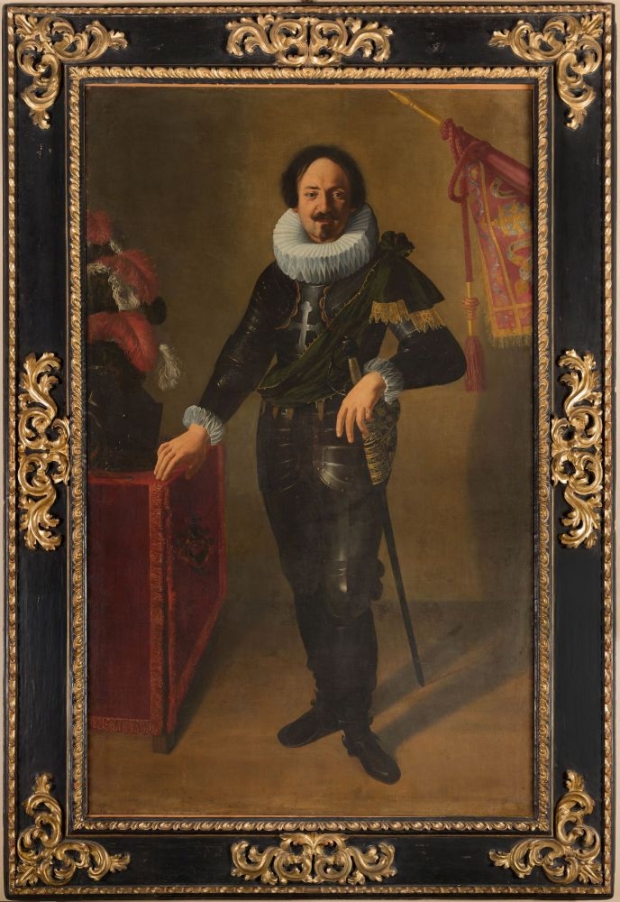 Nel Seicento le armature venivano indossate dai cavalieri solo durante le parate o i tornei. Per questo nel dipinto l’armamento in metallo copre tutto il corpo, ma spuntano dai bracciali i polsini di sottile tessuto e dalla corazza il collo detto ‘a lattuga’. La croce trifogliata forgiata sulla corazza e la fascia in seta, legata sopra, indicano che l’uomo ritratto era membro di un ordine cavalleresco. La lunga spada, uno stocco, e l’elmo piumato, completavano l’armamento, ma avevano soprattutto una funzione simbolica.