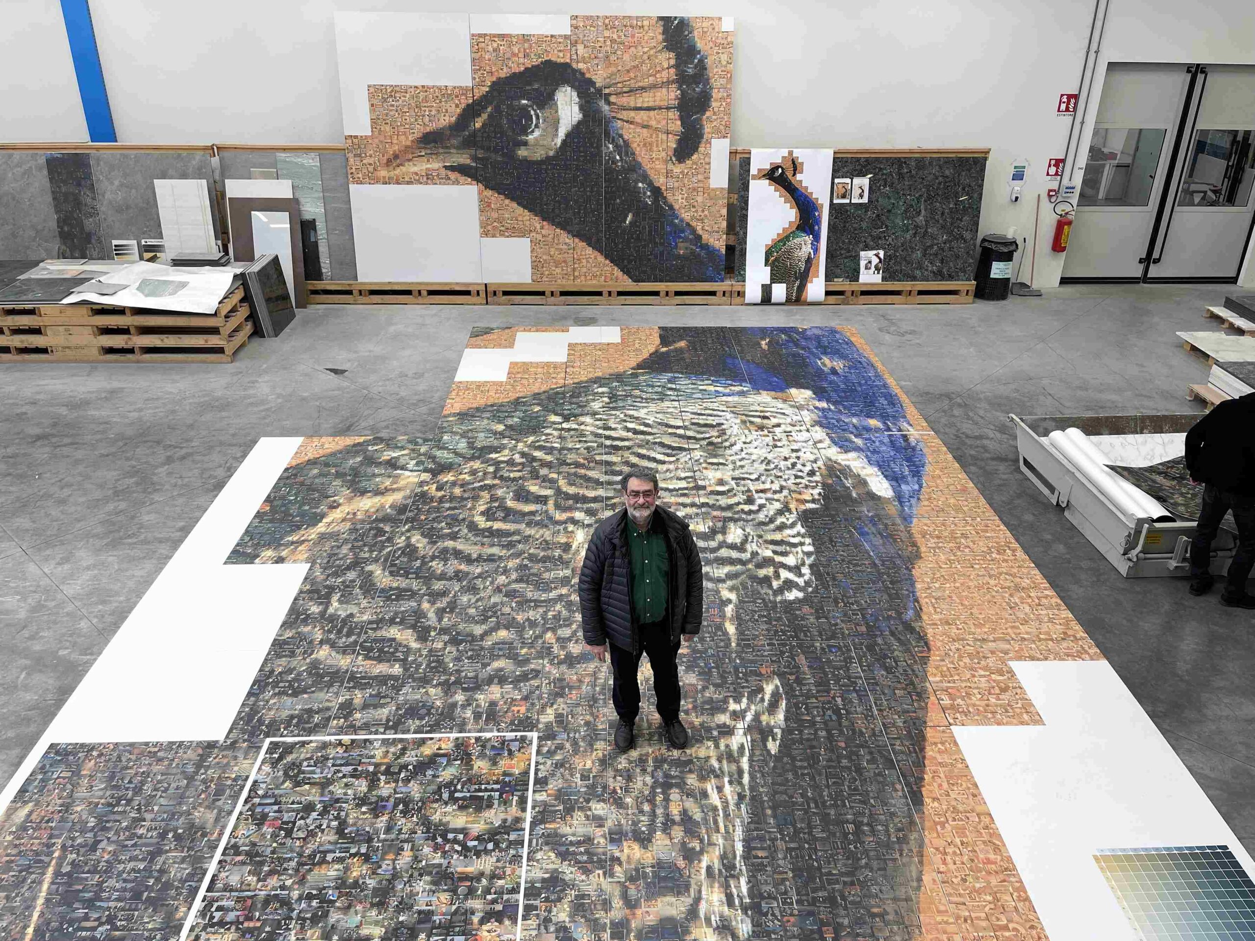 Frutto della chiamata pubblica del Comune di Reggio Emilia e di Fotografia Europea sul tema della curiosità e meraviglia, questa opera monumentale, alta 16 metri, che raffigura un grande pavone è stata realizzata tramite la selezione, ottenuta grazie a un software di elaborazione digitale, tra i 12mila scatti raccolti attraverso una call pubblica cui si aggiungono le fotografie degli oggetti presenti nelle collezioni dei musei. L’opera d’arte pubblica è realizzata con il supporto di Marazzi, il noto marchio fondato nel 1935 a Sassuolo.