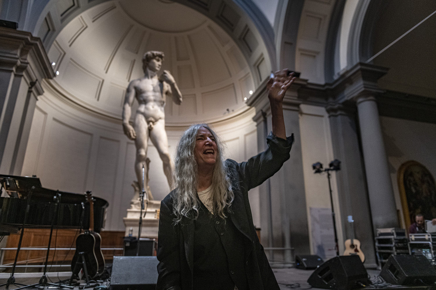 Patti Smith ha dichiarato di essere molto orgogliosa di potersi esibire nella Galleria dell’Accademia, accanto ai lavori di Michelangelo, artista per il quale non ha mai nascosto la sua grande passione. Nel corso della serata del 27 giugno’An Evening Of Poetry And Music’, Patti Smith si è esibita in una formazione acustica, accompagnata dai due figli – Jesse al pianoforte e Jackson alla chitarra- insieme all’amico di lunga data Tony Shanaha, al basso.