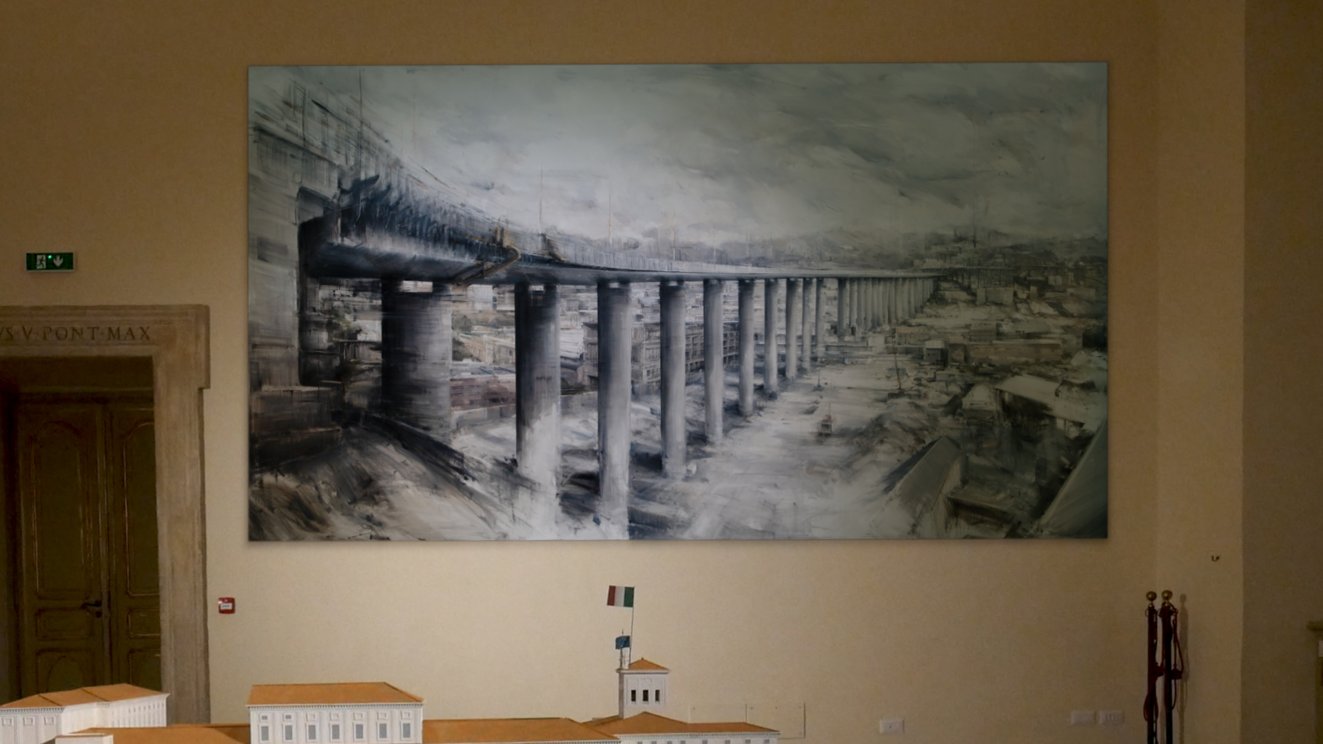 Il quadro realizzato da Alessandro Papetti (Milano 1958) è un olio su tela eccezionale anche per dimensioni (2,7 per 4,5 metri). Raffigura il ponte nella sua interezza, proteso sulla città di Genova con cui si fonde. Il radicamento del ponte tra le case rimanda al rapporto con la comunità, così come la presenza di un cantiere fa memoria e costituisce testimonianza del lavoro svolto per costruirlo.
