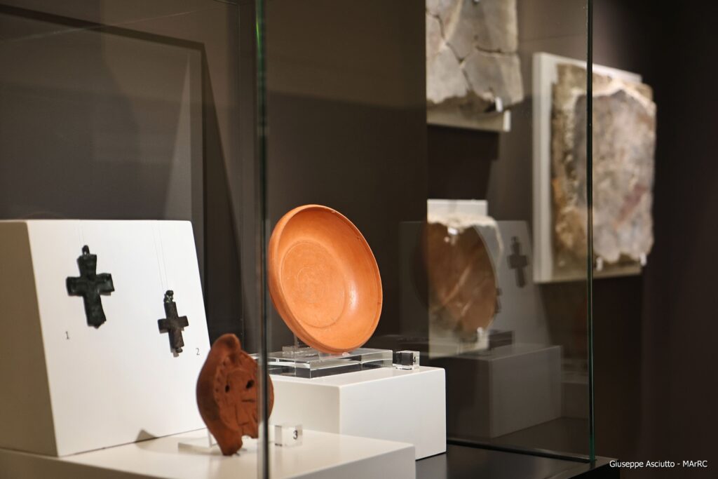 La forza dell’allestimento risiede nel confronto diretto tra le creazioni dello stilista e i reperti archeologici della Magna Grecia e della Calabria protostorica, romana, tardoantica e bizantina. Ornamenti in bronzo e argento, ceramiche figurate, affreschi, decorazioni architettoniche e sculture accompagnano i capi di Versace, svelandone i rimandi iconografici e culturali. Tra i reperti più significativi spiccano la lastra in stucco medievale della chiesa di Santa Maria Theotokos di Terreti, nuovamente visibile dopo oltre quindici anni, i frammenti di affresco con figure di pesci dalle Terme Romane di Reggio Calabria, restaurati per l’occasione, e una statuetta femminile in terracotta proveniente da Rosarno.