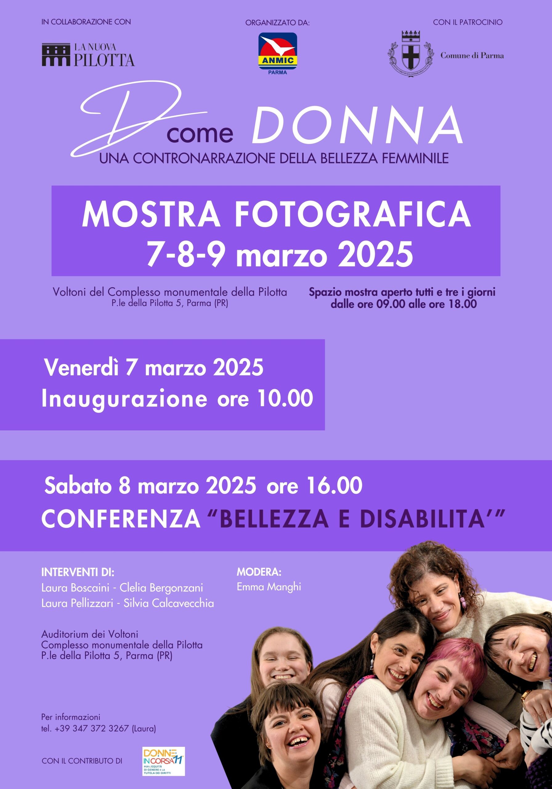 A completare l’evento, sabato 8 marzo dalle 16:00 alle 18:00, si terrà la conferenza Bellezza e disabilità: per una contronarrazione della disabilità femminile, un approfondimento sulla rappresentazione della donna con disabilità e sulle modalità per superare gli stereotipi. L’incontro sarà moderato da Emma Manghi, consigliera aggiunta con delega ai giovani di ANMIC Parma, e vedrà la partecipazione di: Carla Campanini, funzionaria storica dell’arte della Pilotta, Laura Boscaini, co-ideatrice del progetto, Silvia Calcavecchia, influencer e vincitrice del premio ANMIC 2024, Laura Pelizzari, dirigente medico in medicina fisica e riabilitativa, Clelia Bergonzani, coordinatrice del progetto Donne in corsa.