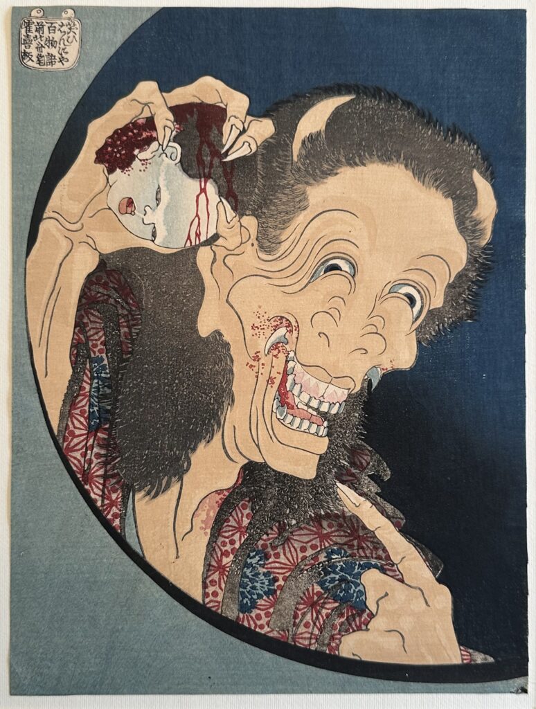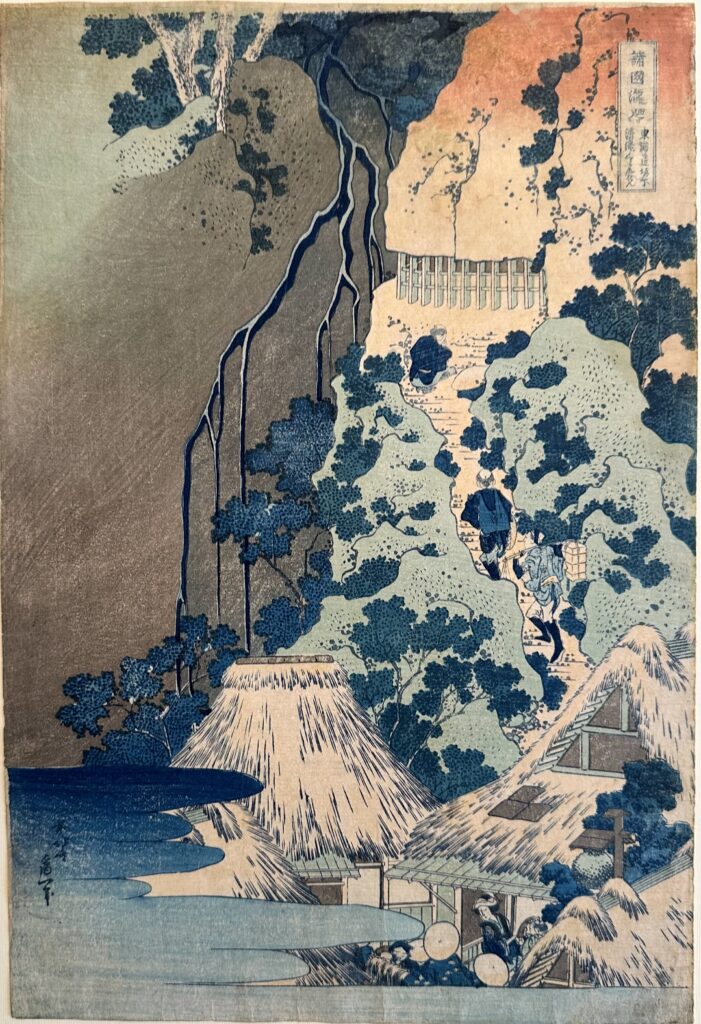 Il percorso espositivo si apre con due xilografie policrome dalla serie Tour delle cascate in varie province, dove la forza dell’acqua si traduce in ritmo visivo e intensità cromatica. Ma è con Il demone Hannya che ride (Warai Hannya, 1831) che si tocca uno dei vertici della mostra: un’opera rarissima, in cui il ghigno dello spirito vendicativo femminile – nato dalla gelosia e trasformato in creatura mostruosa – intreccia iper-realismo, fantasia e un sottile umorismo. L’esemplare esposto colpisce per lo straordinario stato di conservazione e per la presenza del mokume-zuri, le venature del legno visibili nelle prime impressioni, che rendono ogni stampa un oggetto unico. Testimonianza della stagione giovanile sono le tavole della cosiddetta Piccola Tokaido, dedicate alle cinquantatré stazioni del viaggio tra Edo e Kyoto: scene brulicanti di vita quotidiana, animate da una freschezza narrativa sorprendente.