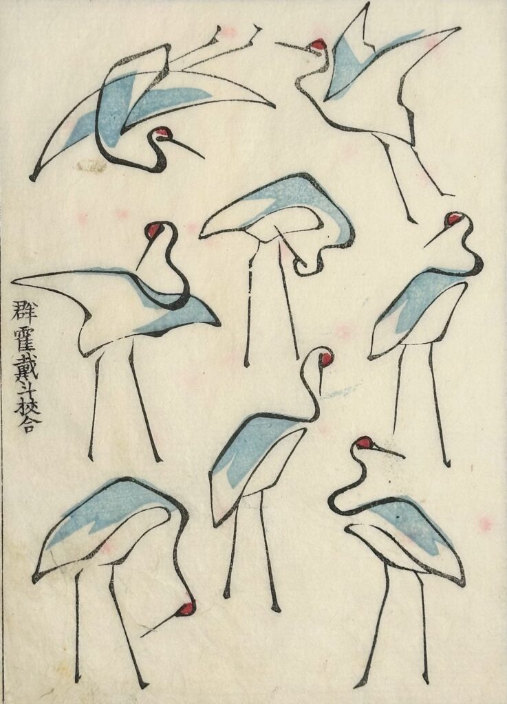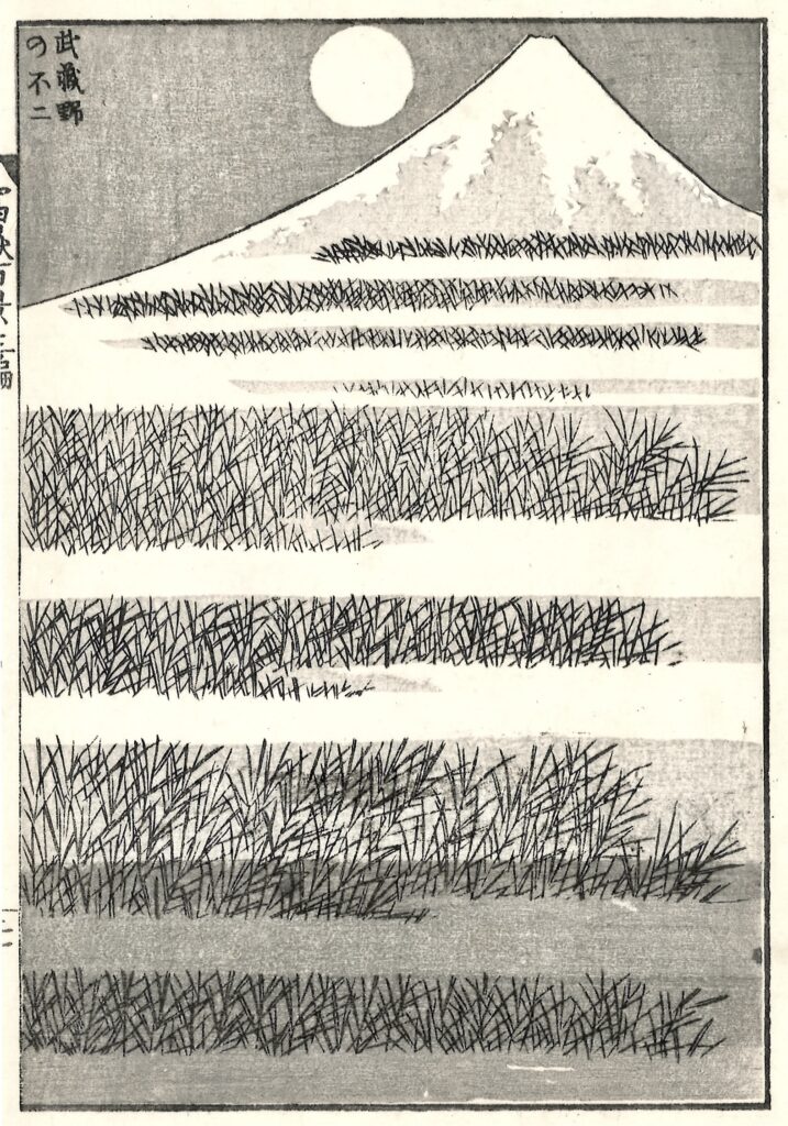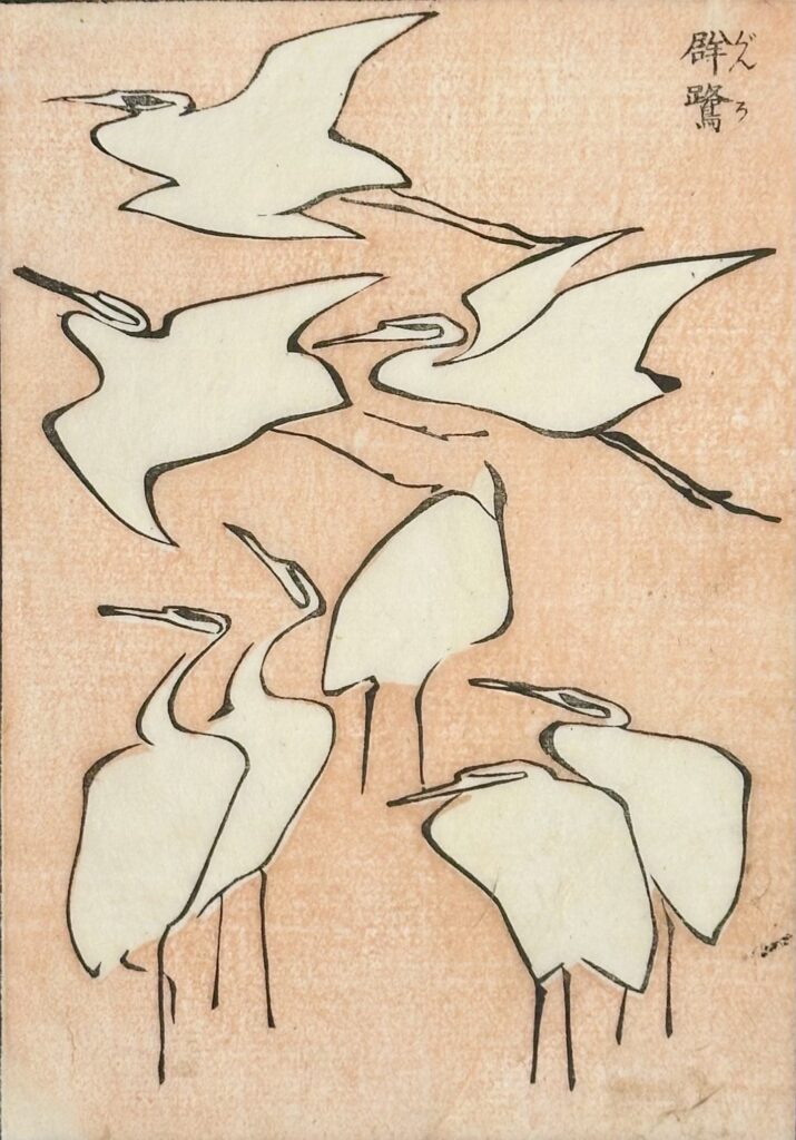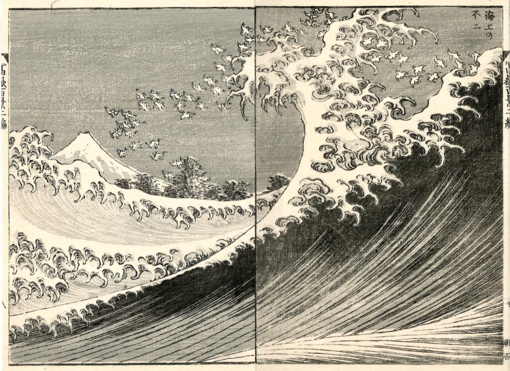 Impossibile non soffermarsi sulla serie che consacrò Hokusai alla fama internazionale, le Trentasei vedute del monte Fuji, da cui proviene anche la celeberrima La Grande Onda. In mostra, tuttavia, l’attenzione critica si concentra soprattutto sulle Cento vedute del monte Fuji: 102 stampe in tre toni di grigio realizzate oltre i settant’anni, dove il monte sacro diventa presenza metafisica. Nell’opera Il Fuji dal mare (Kaijo no Fuji), l’onda si dissolve in uno stormo di pivieri sospesi nel vento, mentre il Fuji emerge come unico punto fermo dell’universo: un’immagine di potente spiritualità, sintesi estrema tra natura e visione interiore.