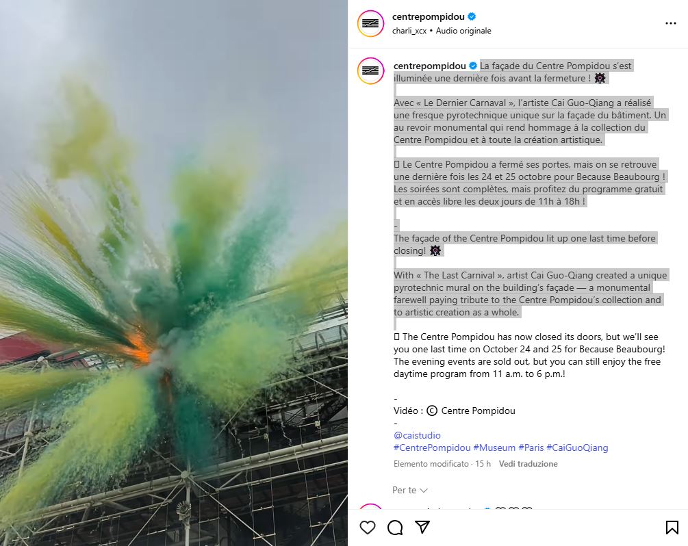 «Nel 2025, il nostro iconico edificio chiuderà per una ristrutturazione che consentirà la sua riapertura nel 2030, riprendendo il suo progetto utopico originario.». Con queste parole, pubblicate su Instagram, il Centre Pompidou ha annunciato ufficialmente la sua chiusura per restauri a partire dal 22 settembre 2025. Poche righe, accompagnate dalle immagini del celebre edificio di Renzo Piano e Richard Rogers, illuminato a giorno dai fuochi pirotecnici de “L’ultimo carnevale”, spettacolo dell’artista Cai Guo-Qiang che ha creato un affresco pirotecnico unico sulla facciata dell’edificio. Un addio a metà, però: è infatti lo stesso Centre Pompidou ha dare appuntamento a visitatori e turisti per un ultimo incontro prima dell’inizio dei restauri il 24 e 25 ottobre. con un programma di iniziative gratuite dalle 11 alle 18.