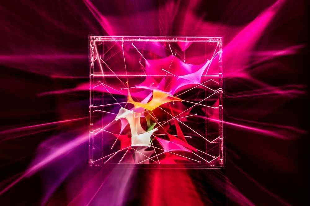 Le opere di Albertí si compongono in reti colorate di lycra semitrasparente, che l’artista adatta, tirandole, in relazione allo spazio, alla ricerca di un equilibrio tra forma e dimensioni dell’ambiente circostante, oppure le ingabbia in cubi trasparenti illuminati, dove il gioco di luci e fili variopinti si riverbera sulle pareti della teca.