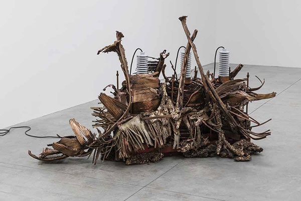 L’opera Blackout (2017) è quella da cui prende il titolo la mostra e che esprime in sintesi i temi cari agli artisti. Si tratta di una scultura realizzata con i resti del trasformatore elettrico esploso nel 2016 causando un blackout a Portorico. Frammenti di ceramica, bobine di trasformatori, rame caricato elettricamente sono assemblati come a creare una sorta di mostruosa centrale elettrica, che produce un ronzio costante. Completa il lavoro la composizione sonora mains hum (2017), realizzata dal musicista americano David Lang, alla terza collaborazione con il duo artistico, che cita una riflessione di Benjamin Franklin sull’energia elettrica. “(…) quanti bei sistemi creiamo per poi doverli distruggere! E se l’elettricità non dovesse risultare utile ad altri scopi, ciò sarà comunque importante, poiché avrà reso umile un Uomo che ha peccato di vanità”. Questa performance vocale, è stata eseguita dal vivo in occasione dell’opening della mostra e per tutta la sua durata secondo un calendario ad hoc, è pensata in collaborazione con gli artisti come parte fondamentale della scultura ed è eseguita dal gruppo vocale romano Voxnova Italia, alla sua seconda collaborazione con Allora & Calzadilla (la prima fu alla Biennale di Venezia del 2015), creando una “impronta sonora” che avvolge tutta la mostra.