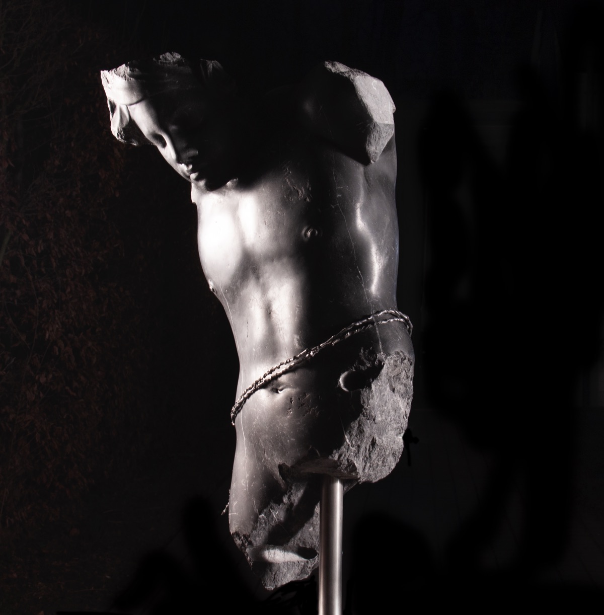Il percorso segue le due fasi dell’alchimia: nigredo, rappresentata da sculture in bronzo patinato adagiate su cartigli di piombo, in cui compaiono crani, volti, anatomie parziali; e albedo, segnata da marmi candidi disposti su supporti plumbei arricchiti da foglia d’oro. Le due polarità non si contrappongono, ma si richiamano come momenti di uno stesso processo trasformativo.