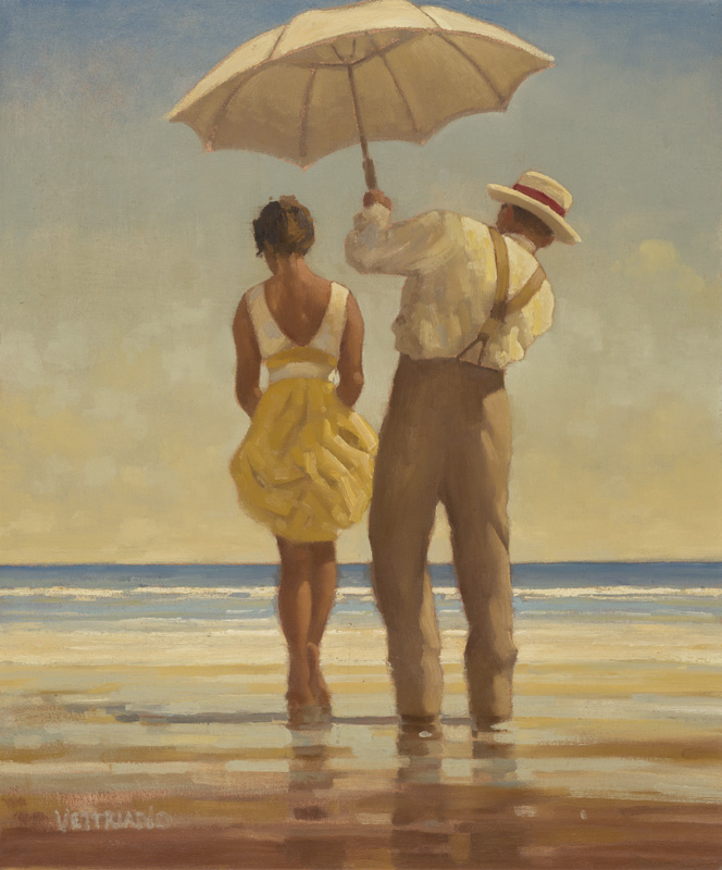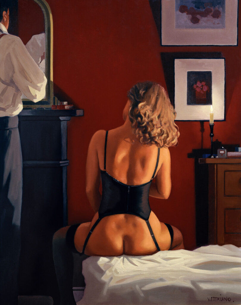 I dipinti di Vettriano mettono in scena un mondo elegante e inquieto, popolato da figure che sembrano protagoniste di storie mai completamente svelate. Coppie che si sfiorano, donne enigmatiche e uomini impeccabili abitano camere d’albergo, sale da ballo, club esclusivi o spiagge battute dal vento. L’amore, declinato in forme romantiche ma spesso ambigue, è il tema ricorrente di una pittura che guarda al noir e al melodramma, costruendo immagini dalla forte impronta cinematografica.