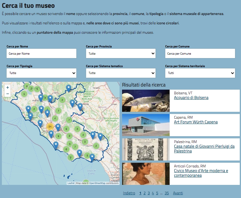 ROMA – “Finalmente la rete dei musei del Lazio è a portata di click” – afferma il presidente della Regione Lazio, Nicola Zingaretti. Dal 2 dicembre, infatti, sul sito www.regione.lazio.it/retemusei/ è possibile cercare un museo scrivendone il nome oppure selezionando la provincia, il comune, la tipologia o il sistema museale di appartenenza, con un primo approccio virtuale e descrittivo alla struttura del Lazio. Cliccando su un puntatore della mappa saranno visualizzate le informazioni principali del museo. Tutte le informazioni saranno costantemente aggiornate per permettere al cittadino e al turista in visita nel Lazio di conoscere questo enorme patrimonio culturale che colora i Comuni delle nostra regione.