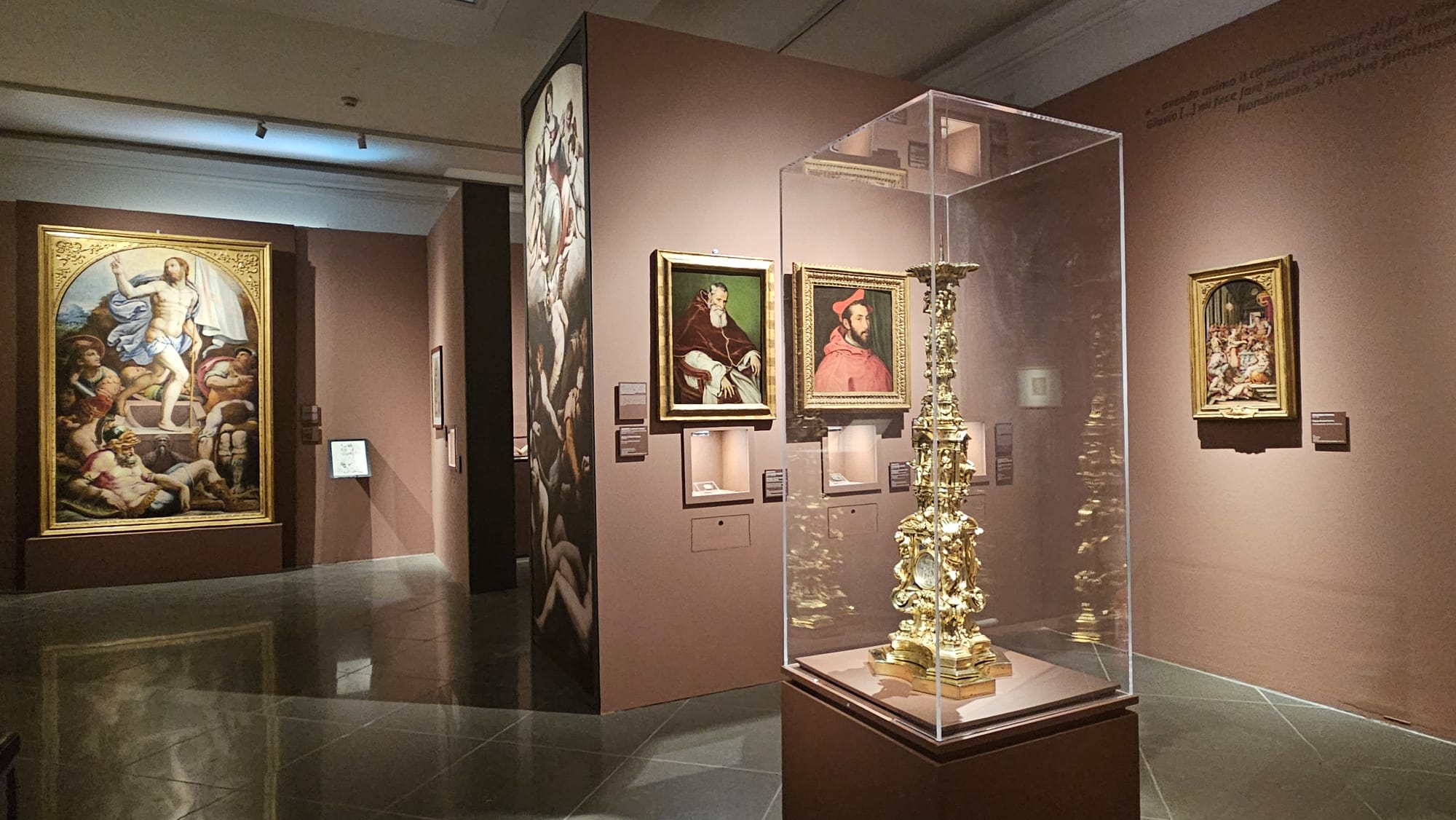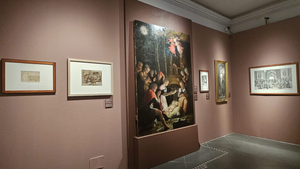 La selezione delle opere — resa possibile da prestiti di istituzioni italiane e internazionali — consente di seguire l’evoluzione del linguaggio vasariano. Non mancano i lavori giovanili, come la raffinata Natività di Camaldoli, nota come “Notte di Camaldoli”, in cui si coglie una sensibilità luministica di ascendenza nordica, né le prove della maturità, dove la costruzione compositiva si fa più complessa e teatrale. Particolarmente significative sono le diverse interpretazioni della Resurrezione, che permettono di osservare come Vasari rielabori modelli precedenti in una chiave sempre più dinamica, e il Ritratto di gentiluomo, testimonianza della sua capacità di confrontarsi con il genere ritrattistico, allora centrale nella definizione dell’identità sociale. Il culmine del percorso è rappresentato dall’attività in Vaticano, con riferimento alla decorazione della Sala Regia, realizzata negli anni Settanta del Cinquecento. Qui emerge con chiarezza la cifra distintiva della “Maniera Moderna”: una sintesi di pittura, architettura e scultura che ambisce a un’unità spettacolare e totalizzante.