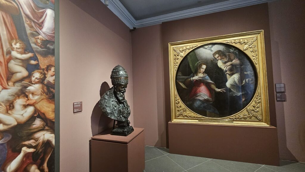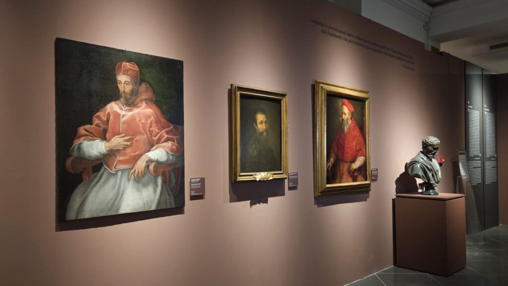 Uno degli aspetti più convincenti della mostra è l’attenzione alle reti relazionali. Il successo romano di Vasari non si spiega senza il sostegno di figure chiave come Bindo Altoviti e Paolo Giovio, protagonisti di una committenza colta e strategica. Attraverso di loro, l’artista accede a un sistema in cui arte e politica sono profondamente intrecciate. Roma, in questo senso, è anche un teatro di rappresentazione del potere papale. I cantieri decorativi — dalla Cancelleria alle imprese vaticane — diventano luoghi in cui si definisce un linguaggio visivo capace di tradurre in immagini l’autorità della Chiesa. Vasari si muove con abilità in questo contesto, costruendo una carriera che lo porta a collaborare con pontefici come Papa Giulio III e Papa Pio V.