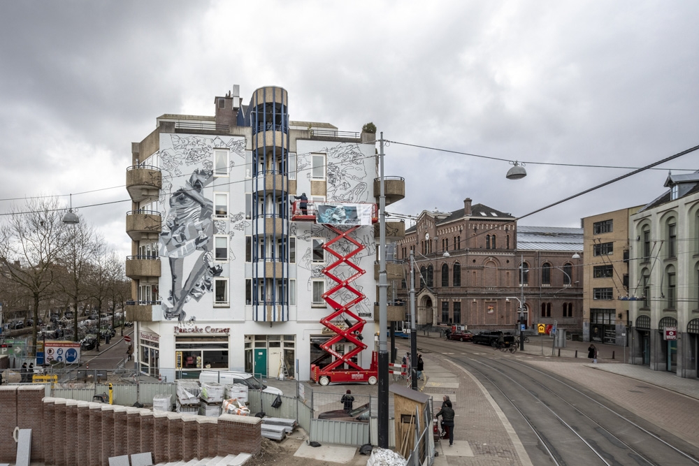 L’artista ha iniziato lunedì 15 marzo a dipingere sopra un muro di un edificio dell’associazione per l’edilizia abitativa De Alliantie, in Amsterdam-Centrum. JDL userà la pittura italiana “Airlite Sunlight”: una nuova tecnologia che purifica l’aria e combatte l’inquinamento atmosferico.