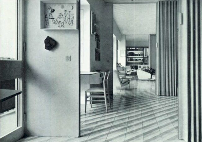 Gio Ponti via Dezza, Gio Ponti, sistemazione del proprio appartamento nell’edificio di via Dezza 49, Domus 334, 1957, Gli ambienti di facciata in infilata[/caption]