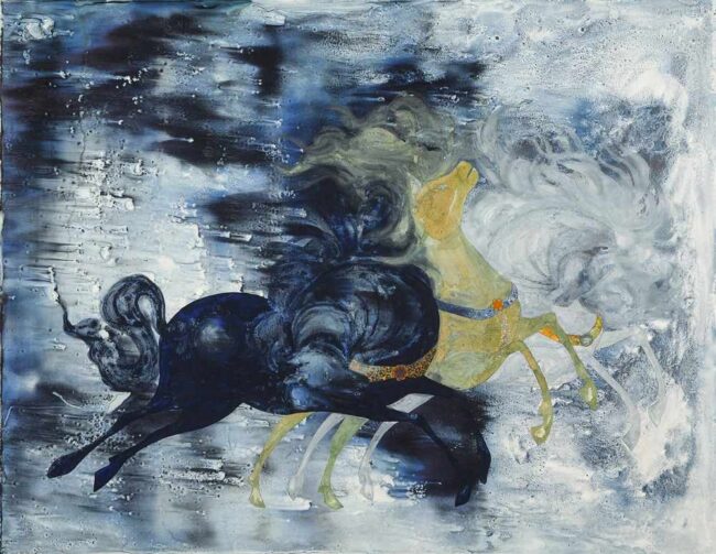 Veronica Smirnoff, Dancers In the Storm, 2018, egg tempera on wood, 100 x 130 cm[/caption]