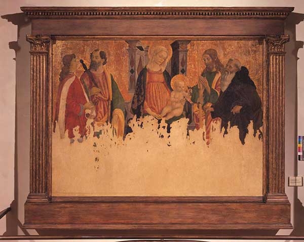 Francesco Botticini Madonna in trono col Bambino e i santi Sebastiano, Simone zelota, Giuda Taddeo e Antonio abate 1479-1480 dipinto su tavola trasportato su supporto listellare, cm 145 × 215 Campi Bisenzio, Chiesa di Sant’Andrea a San Donnino, GR 5377[/caption]