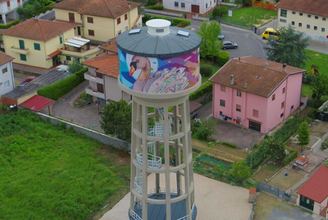 Torre pensile dipinta da Refreshink, Montopoli (Pisa), Rainbow 2019. Ph. Claudio Bellosta Studio[/caption]