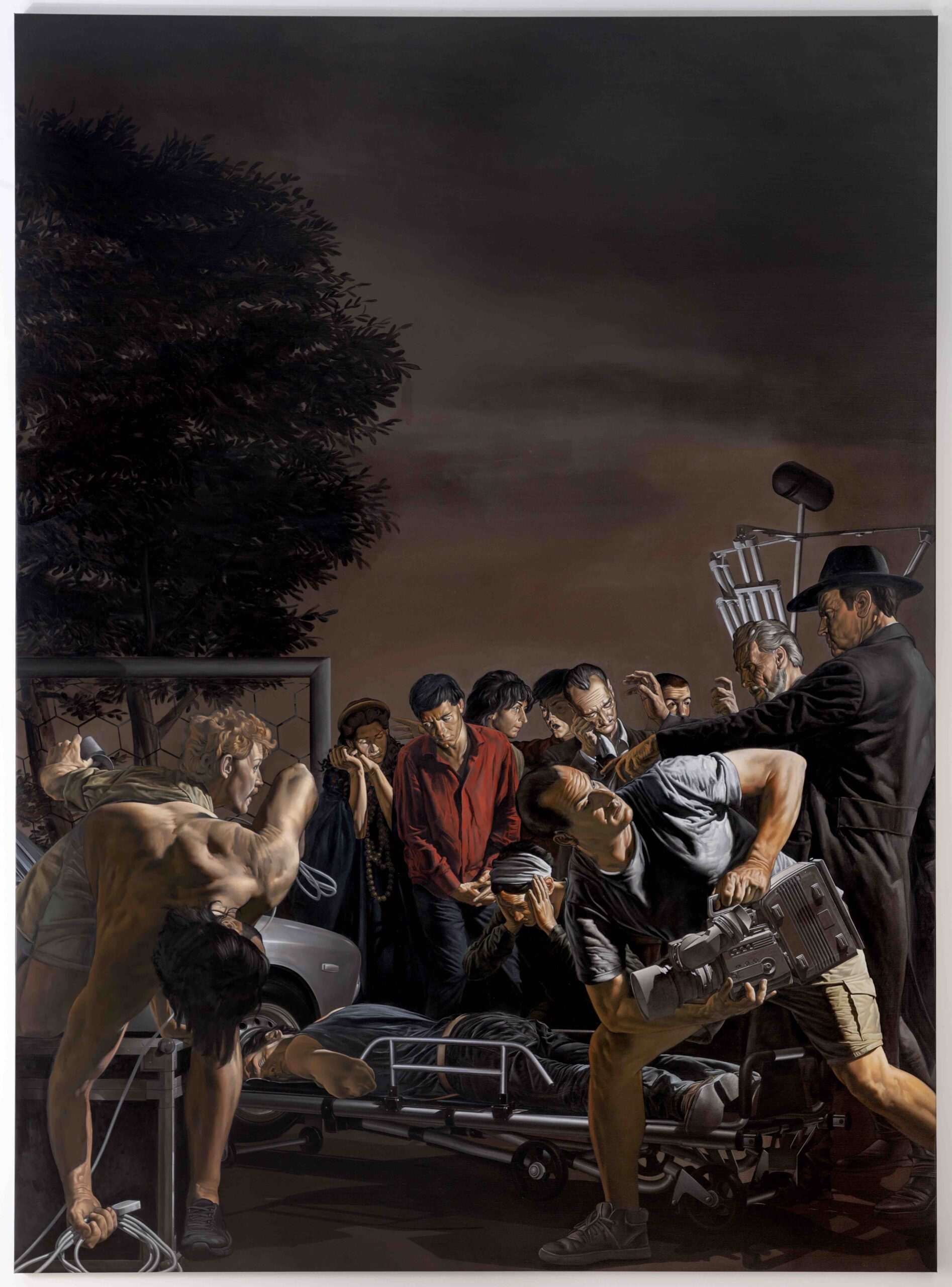 Al centro dell’esposizione un grande dipinto che, nella sua monumentalità e ricchezza iconografica, ispirata alle antiche pale d’altare, rappresenta il corpo di Pasolini mentre attraversa a ritroso la propria vita. Altri dipinti, sempre di grandi dimensioni, approfondiscono ulteriori aspetti connessi al dipinto principale. Un fregio, una scultura, che ritrae in modo estremamente realistico Pasolini e alcune teste scolpite completano la rassegna, arricchita ulteriormente di proiezioni video e fotografie, mentre tutto il percorso espositivo è accompagnato da musiche sinfoniche.
