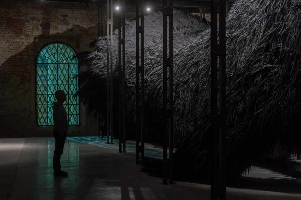 The Teaching Tree è una struttura organica, dalla forma enigmatica, che riempie l’intero Padiglione. Lunga 40 metri è costituita da fronde di palma dipinte di nero e animate da componenti pneumatiche.