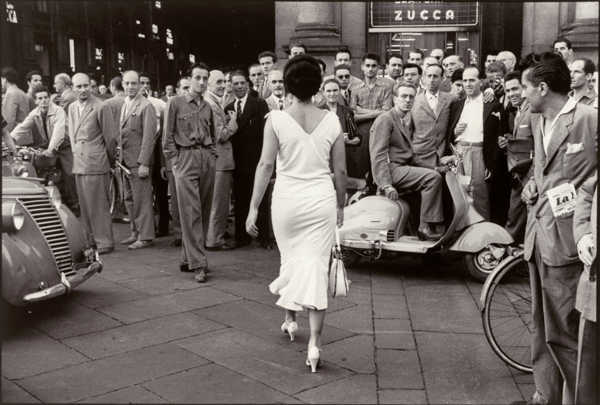 Fra le numerose opere in mostra ci sono alcuni degli scatti più riconoscibili di questo periodo, capolavori che hanno fatto la storia della fotografia internazionale come «La strada per Palermo», realizzata da Robert Capa nel 1943, «American girl in Italy, Firenze» di Ruth Orkin del 1951, e il reportage dedicato all’Italia da Henri Cartier-Bresson nel 1952. Ma anche autentiche “pietre miliari”, ormai conosciute in tutto il mondo come «Gli italiani si voltano» (1954) di Mario De Biasi; i due amanti appartati fra le dune di un lido veneziano, scovati da Gianni Berengo Gardin nel 1958; «Palermo, via S. Agostino» (1960) di Enzo Sellerio; gli iconici seminaristi che giocano nella neve, ritratti da Mario Giacomelli nel 1961; la serie «Mondo Cocktail», realizzata da Carla Cerati all’inizio degli anni Settanta durante le inaugurazioni di gallerie d’arte e negozi della Milano bene. Comprende inoltre racconti di decenni successivi che hanno contribuito alla nascita di un nuovo modo di intendere l’immagine,come le celebri «Verifiche» (1969-72) di Ugo Mulas, attraverso cui il fotografo ha indagato e scardinato alcuni dogmi del linguaggio fotografico; il fondamentale viaggio che Luigi Ghirri compie nel 1973 attraverso gli stati, i deserti, gli oceani e le galassie sfogliando le pagine di un atlante; i «Ritratti di fabbriche» (1978-80) di Gabriele Basilico; la cultura millenaria mediterranea riletta, a cavallo fra gli anni Ottanta e Novanta, attraverso la forza espressiva delle immagini di Mimmo Jodice, solo per citare alcune ricerche particolarmente iconiche di questa preziosa collezione.
