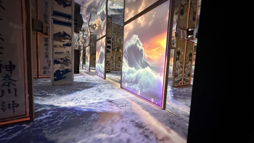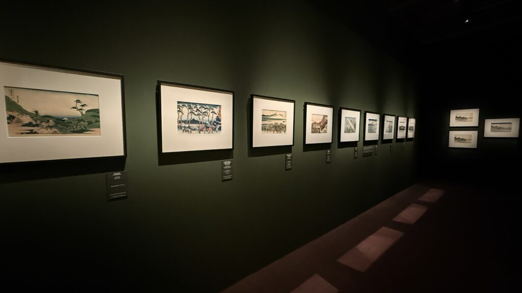 Il percorso si articola in dodici sezioni tematiche. Si parte dal contesto dell’Ukiyo-e, nato nel Giappone urbano del periodo Edo, dove la crescita dei ceti mercantili favorisce una nuova sensibilità estetica legata al piacere dell’effimero. Si prosegue con l’analisi dei molteplici nomi d’arte adottati da Hokusai, che scandiscono le diverse fasi della sua produzione e testimoniano una continua tensione al cambiamento. Ampio spazio è dedicato ai grandi cicli iconografici: le vedute lungo la via del Tōkaidō, racconto visivo di un Giappone in movimento; la serie Trentasei vedute del Monte Fuji, in cui la montagna sacra diventa perno simbolico e compositivo; e gli studi sull’acqua, come in Un viaggio tra le cascate di varie province, dove la natura si manifesta come energia dinamica e trasformativa. Culmine del percorso è la celebre La Grande Onda di Kanagawa, sintesi perfetta di potenza espressiva e controllo formale.