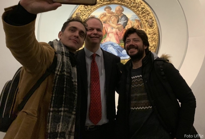 Una visita di circa un’ora durante la quale attori e regista hanno avuto la possibilità di ammirare i capolavori custoditi nel museo, dai Duchi di Urbino di Piero della Francesca, alla Primavera e Venere del Botticelli, dalla tribuna del Buontalenti, all’Adorazione dei Magi e l’Annunciazione di Leonardo, dal Tondo Doni di Michelangelo, davanti al quale si sono anche concessi un selfie, alla Medusa e il Bacco di Caravaggio.