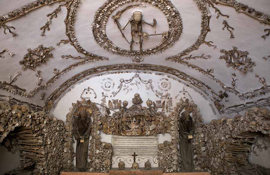 La Cripta-Cimitero, opera d’arte singolare, realizzata verso la prima metà del 1700, nacque dall’esigenza pratica di fare posto ai nuovi defunti nel piccolo cimitero del convento e quindi trovare una giusta collocazione per le ossa dei frati riesumati. Le ossa furono sistemate in un certo ordine lungo le pareti e si iniziò a seppellirvi frati ed anche i poveri di Roma, ai quali era riservato il sepolcro posto nel pavimento della cappella per la Messa. In questo luogo sono stati raccolti i resti mortali di circa 3.700 defunti, per lo più frati cappuccini. Tradizione vuole che la terra di questo cimitero sia santa, perché trasportata qui dalla Palestina o addirittura da Gerusalemme.