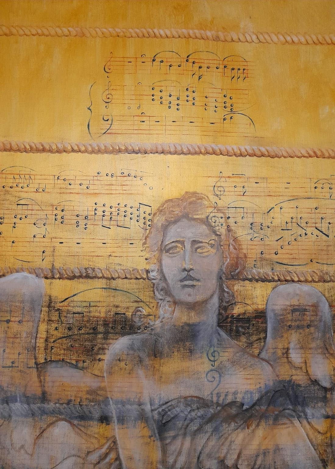 Venticinque i dipinti di Veneziano in mostra, di cui dodici richiamano – con linee orizzontali parallele che ricordano lo spartito musicale – l’intero repertorio operistico pucciniano. Tali partiture aeree e pittoriche appaiono separate tra loro da intervalli visivi: corde, fili, rami, scale, onde del mare, che diventano elementi leggeri ed eterei, portatori della suggestione primaria di Puccini che evolve in nuovi significati.
